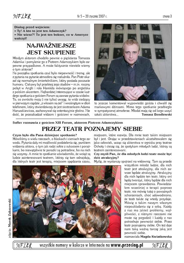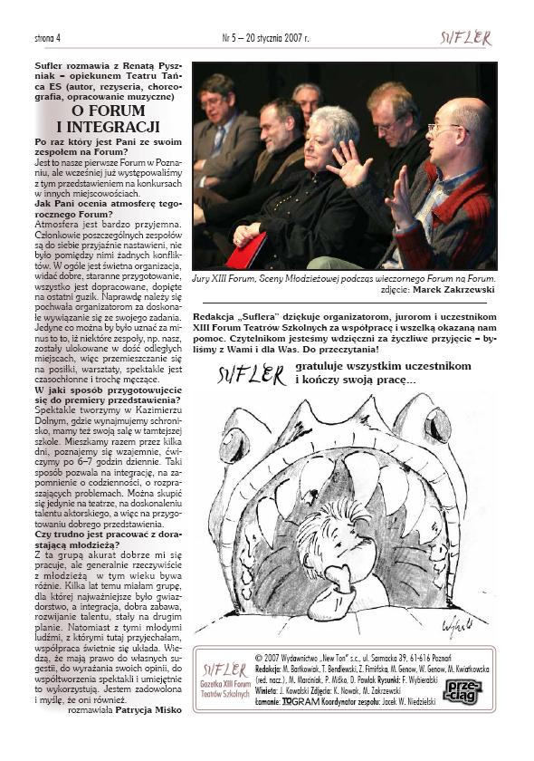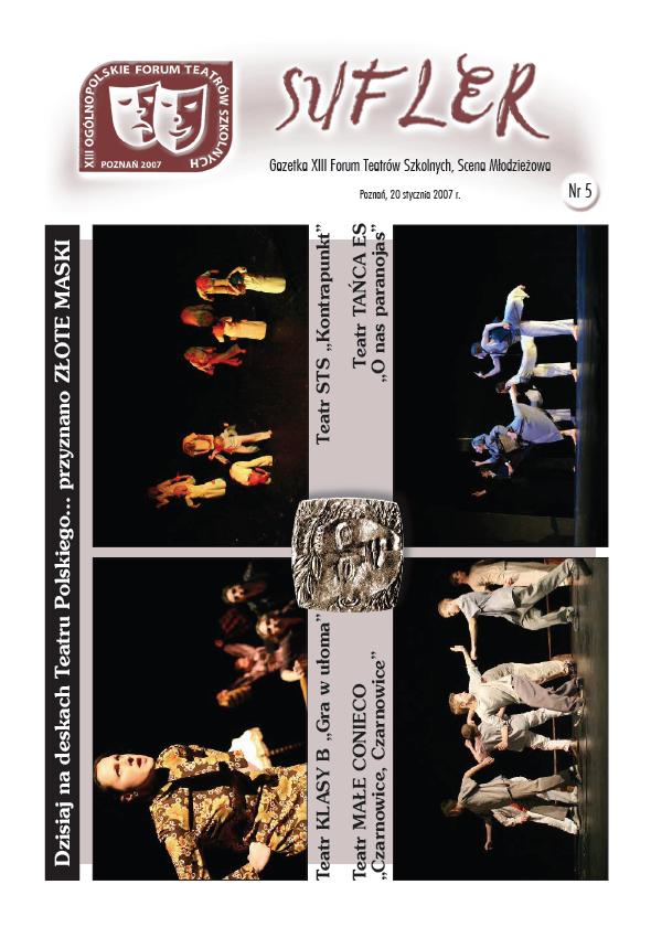 ZŁOTE MASKI . PROTOKÓŁ Z POSIEDZENIA JURY SCENA MŁODZIEŻOWA Jury XIII Forum po obejrzeniu w dniach 16–18.01.2007 r. postanowiło przyznać następujące nagrody i wyróżnienia: 1. ZŁOTA MASKA i Nagroda Ministra Edukacji Narodowej w wysokości 3000 zł dla Teatru KLASY B z VI Liceum Ogólnokształcącego w Łodzi za spektakl pt. „GRA W UŁOMA” 2. ZŁOTA MASKA i Nagroda Wojewody Wielkopolskiego w wysokości 3000 zł dla Teatru STS czyli STOWARZYSZENIE TEATRALNYCH SZALEŃ- CÓW z Pałacu Młodzieży w Szczecinie za spektakl pt. „KONTRAPUNKT” 3. ZŁOTA MASKA i Nagroda Wielkopolskiego Kuratora Oświaty w wysokości 3000 zł dla Teatru MAŁE CONIECO z Publicznego Gimnazjum w Czarnowicach za spektakl pt. „CZARNOWICE, CZARNOWICE....” 4. ZŁOTA MASKA i Nagroda Marszałka Województwa Wielkopolskiego nagroda rzeczowa (kamera z twardym dyskiem) dla Teatru TAŃCA ES z Dzielnicowego Domu Kultury Spółdzielni Mieszkaniowej Czechów w Lublinie za spektakl pt. „O NAS PARANOJAS” 5. NAGRODA SPECJALNA i Nagroda Prezydenta Miasta Poznania nagroda rzeczowa (kamera i nagrywarka DVD) dla Teatru PANOPTICUM z Młodzieżowego Domu Kultury w Lublinie za spektakl pt. „POCZEKALNIA” 6. Nagroda Ministra Edukacji Narodowej nagroda rzeczowa dla Teatru NIESKROMNY z II Liceum Ogólnokształcącego w Olsztynie za spektakl pt. „STUDNIA” 7. Nagroda Ministra Edukacji Narodowej nagroda rzeczowa dla Teatru TROP ze Stowarzyszenia Czasu Wolnego Dzieci i Młodzieży w Katowicach za spektakl pt. ,,WITKACOWO, CZYLI MAMY MAMY...” 8. Wyróżnienie Ministra Edukacji Narodowej nagroda rzeczowa dla Teatru SPÓŁKA z o.o. z Miejsko- Gminnego Ośrodka Kultury w Głogówku za spektakl pt. „WARIACJE HISZPAŃSKIE” 9. Wyróżnienie Ministra Edukacji Narodowej nagroda rzeczowa dla Teatru PRESTIDIGITATOR z XI Liceum Ogólnokształcącego w Białymstoku za spektakl pt. „KAPTUREK CZERWONY” Wyróżnienia Ministra Edukacji Narodowej dla instruktorów (nagrody rzeczowe): 1. Dla ANNY CISZOWSKIEJ z Teatru KLASY B w Łodzi 2. Dla GRAŻYNY PFEIFFER-PODLASZEWSKIEJ z Teatru STS czyli STOWARZYSZENIE TEATRALNYCH SZALEŃCÓW w Szczecinie 3. Dla RENATY PYSZNIAK z Teatru TAŃCA ES w Lublinie 4. Dla DANUTY i KRZYSZTOFA IRISIKÓW z Teatru MAŁE CONIECO w Czarnowicach 5. Dla ANTONINY SOKOŁOWSKIEJ z Teatru MANDRAGORA w Białymstoku 6. Dla GRAŻYNY SMOLIBOCKIEJ z Teatru ZAMIAST w Tarnowie Podgórnym Ponadto swoje nagrody przyznali: 1. Nagroda Dyrektora Teatru Polskiego w Poznaniu dla Teatru NIESKROMNY z Olsztyna 2. Nagroda Dyrektora Centrum Sztuki Dziecka w Poznaniu dla Teatru MAŁE CONIECO z Czarnowic 3. Nagroda Dyrektora Centrum Sztuki Dziecka w Poznaniu dla instruktorów: ANNY CISZOWSKIEJ z Teatru KLASY B w Łodzi DANUTY i KRZYSZTOFA IRISIKÓW z Teatru MAŁE CONIECO w Czarnowicach MONIKI KLIMASARY z Teatru PROGRESS w Rabce Zdroju BARBARY JUSZKIEWICZ z Teatru NIESKROMNY w Olsztynie Nagroda za plakat dla Teatru EKSPOZYCJA z Młodzieżowego Domu Kultury nr 2 w Poznaniu W komentarzu do werdyktu Jury wyraża przekonanie, że nie oceny rozstrzygają o sensie i wartości waszej pracy. Każdy musi się zdobyć na wysiłek własnej drogi i własnych wyborów. Jury wyraża serdeczne podziękowania za bardzo dobrą organizację i miłą atmosferę XIII Ogólnopolskiego Forum Teatrów Szkolnych, Scena Młodzieżowa i składa je na ręce Pani Dyrektor Młodzieżowego Domu Kultury nr 2 w Poznaniu Elwiry Dąbkiewicz-Wolan i jej wspaniałych współpracowników. Wyrazy podziękowania i szacunku składamy Pani Ewie Repsch, Głównemu Wizytatorowi Ministerstwa Edukacji Narodowej. Jury zauważa wysoki poziom i różnorodność prezentowanych spektakli, co potwierdza potrzebę kontynuacji Forum umacniania jego pozycji na mapie kulturalnej Polski. ![]() .